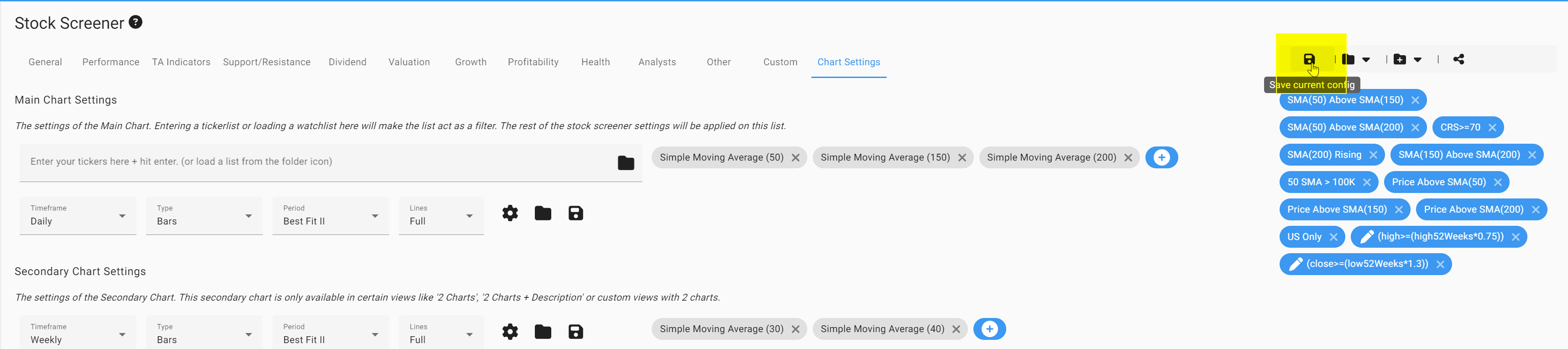 Click the disk icon in the upper-right corner of the stock screener page.