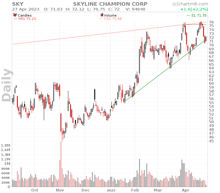 By starting with the same screen as above, but filtering for stocks with a technical rating below or at 5, we get a list of stocks that are not as trending and nearing their support line. They may present an opportunity for shorting when the support line does not hold.