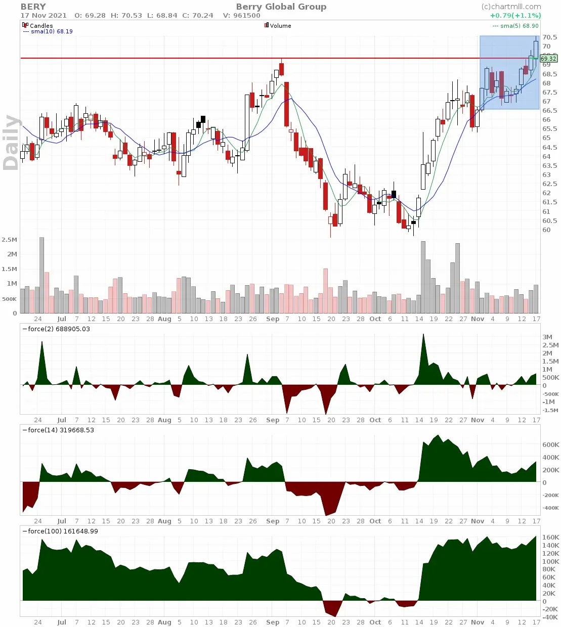 On 2021/10/20 this stock broke out of its existing trading range with huge volume and a firm gap up. Chances are that you had missed this breakout. In the meantime, however, the price dropped a bit but the seller volume remained low in the process. The last inside candle on the chart coincides with the trigger signal given by the Force Index (2) indicator. At the same time, there are quite a few other elements on the chart that show that this is indeed a potential low-risk entry. Buying from $50.45 with a short stoploss just below $48.55 is a great opportunity to capitalize on the breakout that occurred earlier.