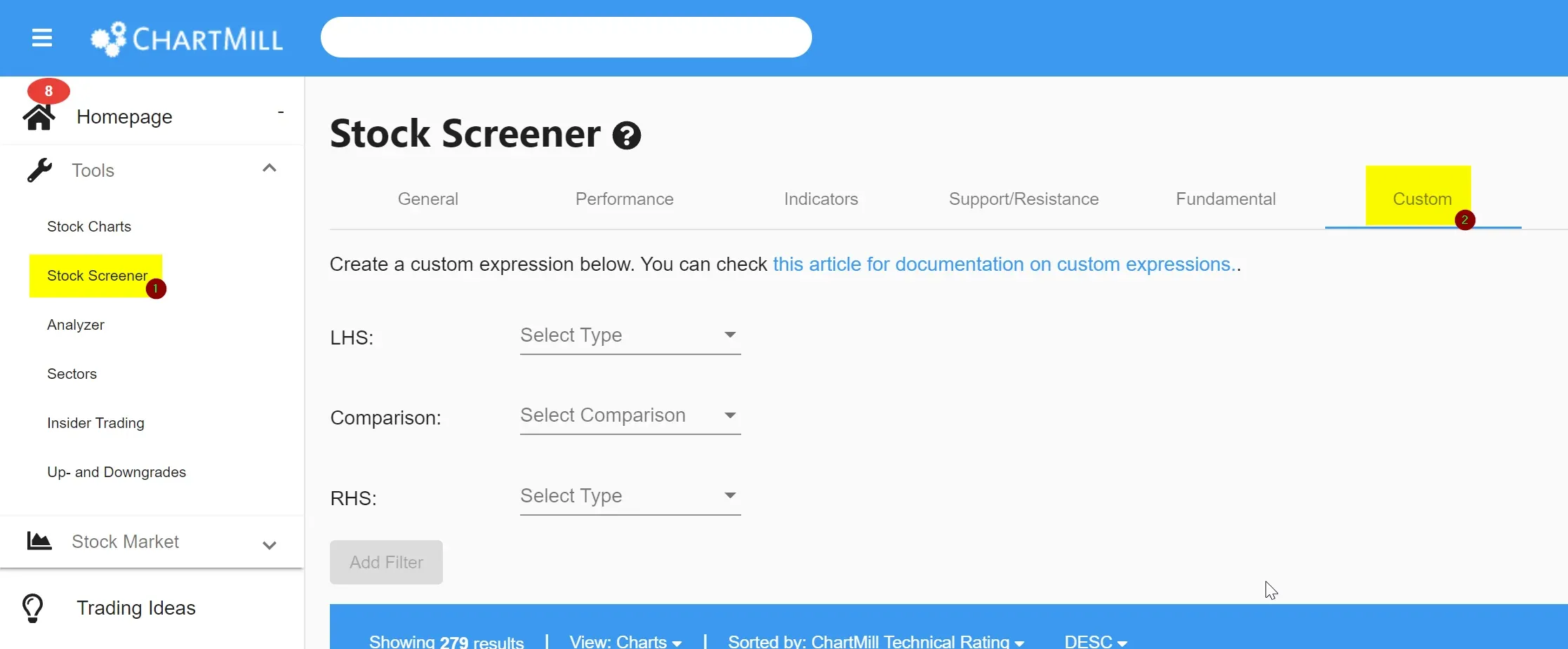 Those who want even more control can use the custom expressions section. Here you can also set filters on the high, low and close of a trading day, even based on the price of the previous trading day.
