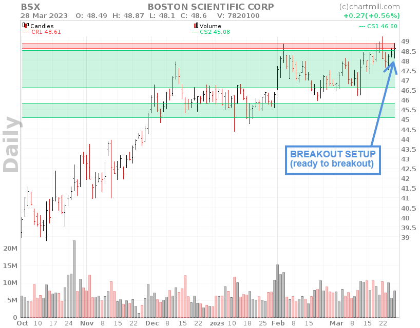 The fastest and most efficient way to find breakout setups is to use a stock screener such as ChartMill. The many filtering options allow you to be very specific.