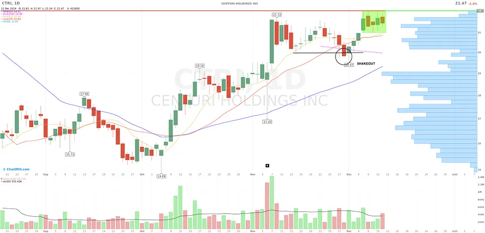 A nice up-to-date setup (on the day this article is published) based on the High Pressure Short Squeeze Screen mentioned above, is the stock CENTURI HOLDINGS INC (CTRI).