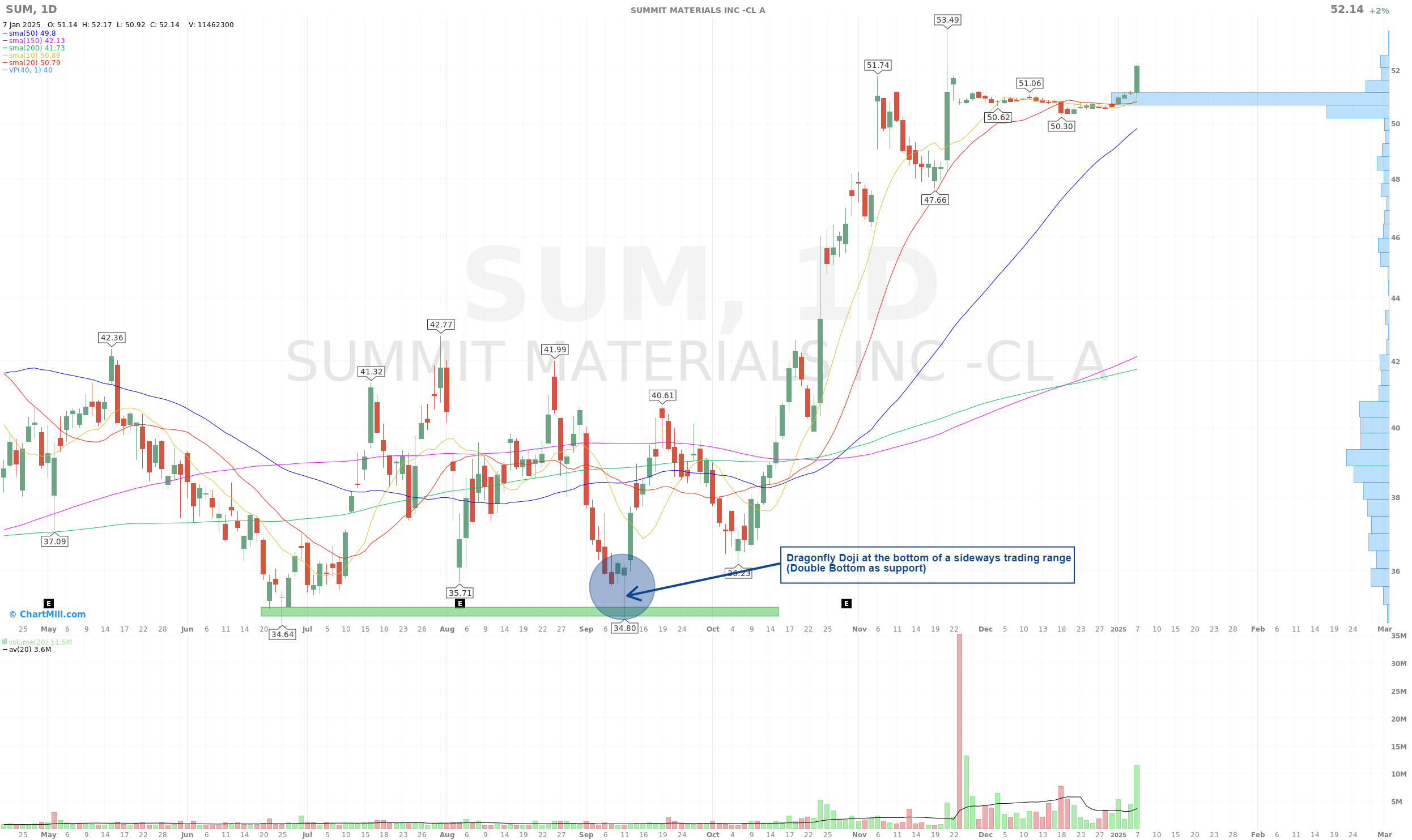 The chart below (ticker: SUM) shows a dragonfly doji candle in a sideways trading range forming a double bottom. Meanwhile, the price has risen more than 45%.