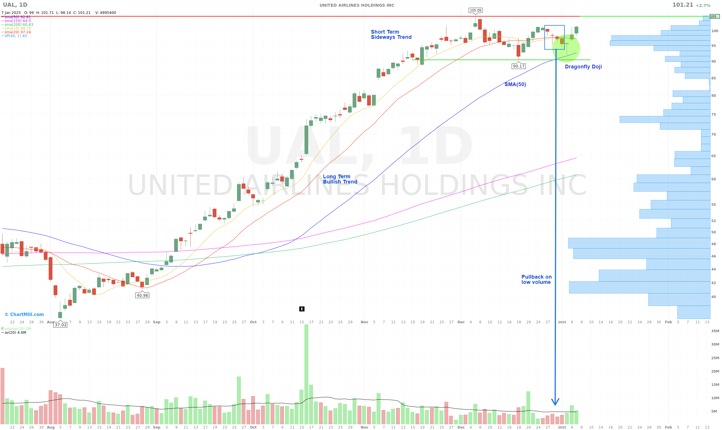 In the chart below (ticker: UAL), observe how the Dragonfly Doji formed in a sideways trend just after a pullback, while testing the SMA(50), followed by a strong recovery move in the following days.