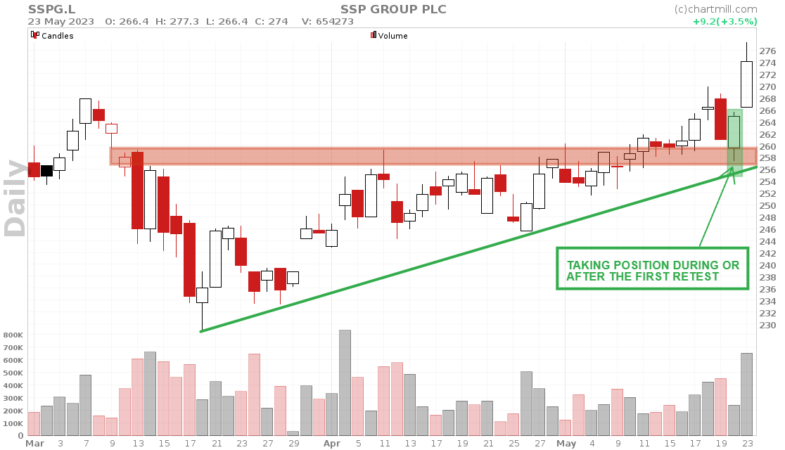 For the second approach, after the initial breakout, one waits until the price drops again to the previous resistance level. Only then is a position bought.