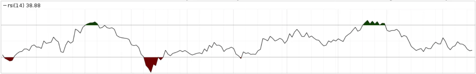 Visually the indicator looks like this, you can recognize the peaks above 70 and the troughs below 30: