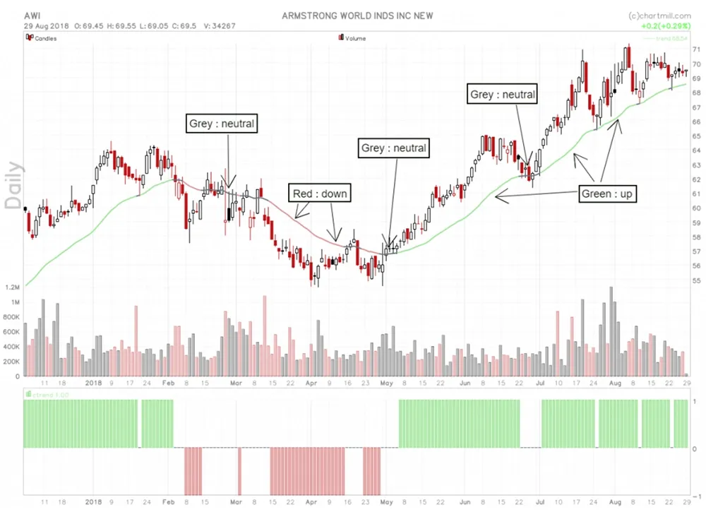 The ChartMill Trend Indicator is an exponential moving average line that roughly represents the trend of the share. You can display it as an overlay on a chart or as a bar indicator underneath the chart. If the indicator is green, the price rises, the line is red when the price falls and grey means that the price zone is neutral.