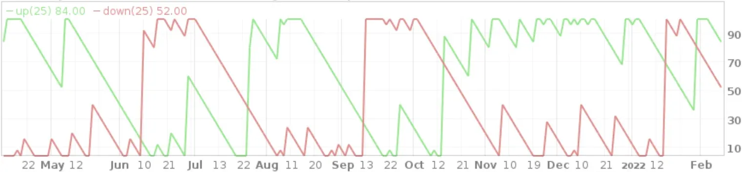 All values are calculated as a percentage value indicating the time since the previous high within the specified period (default '25').