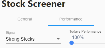 Strong stocks can be filtered for in the screener by selecting 'strong stocks' in the 'signal' filters on the perfomance tab: