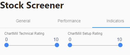 You can select the values you need for your screen. This example lists all stocks with a Technical Rating of at least 8 and a Setup Rating of at least 8. Note that only a limited number of stocks might be listed due to market conditions.