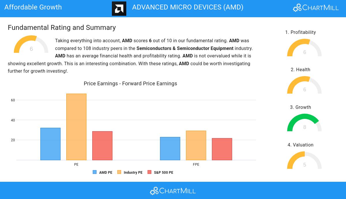 ChartMill assigns a Valuation Rating to each stock, ranging from 0 to 10. This rating is calculated by analyzing different valuation elements, such as price to earnings and free cash flow, both in absolute terms and relative to the market and industry. In the case of AMD, the assigned 5 reflects its valuation: