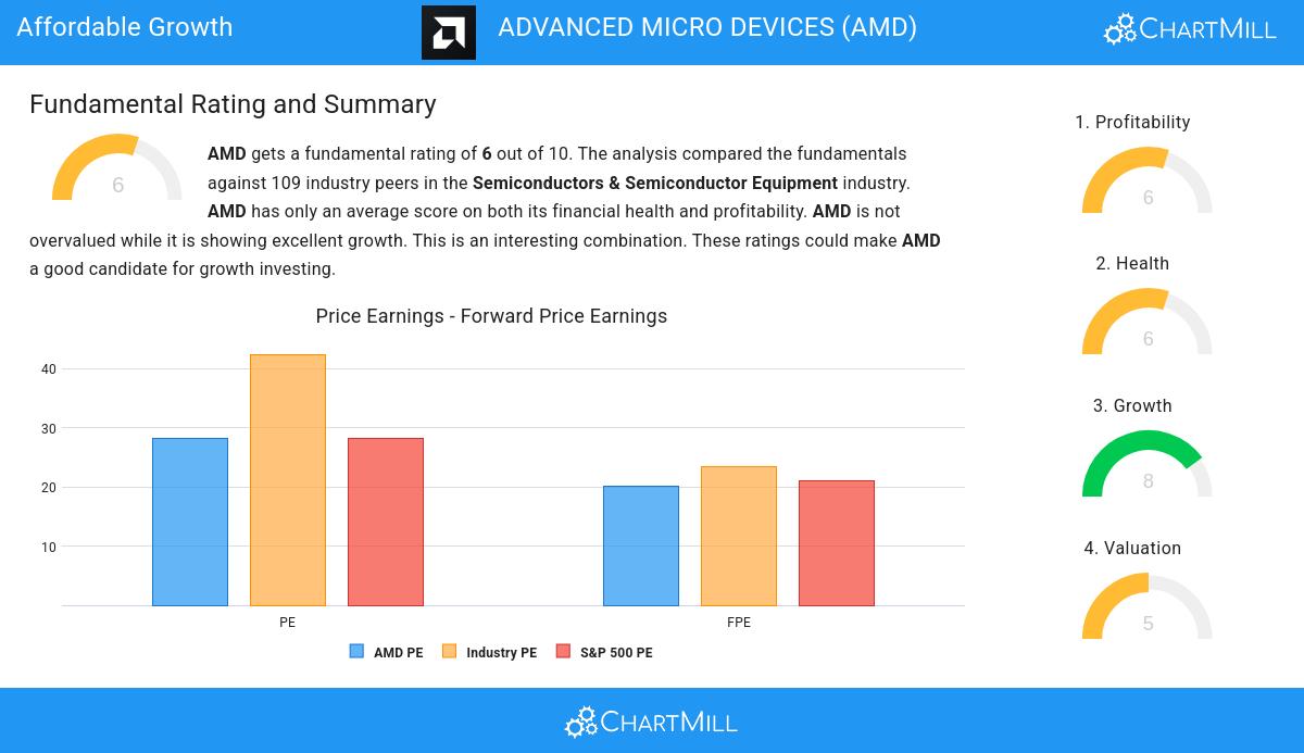 ChartMill employs its own Growth Rating system for all stocks. This score, ranging from 0 to 10, is derived by evaluating different growth factors, such as EPS and revenue growth, taking into account both past performance and future projections. AMD has earned a 8 for growth: