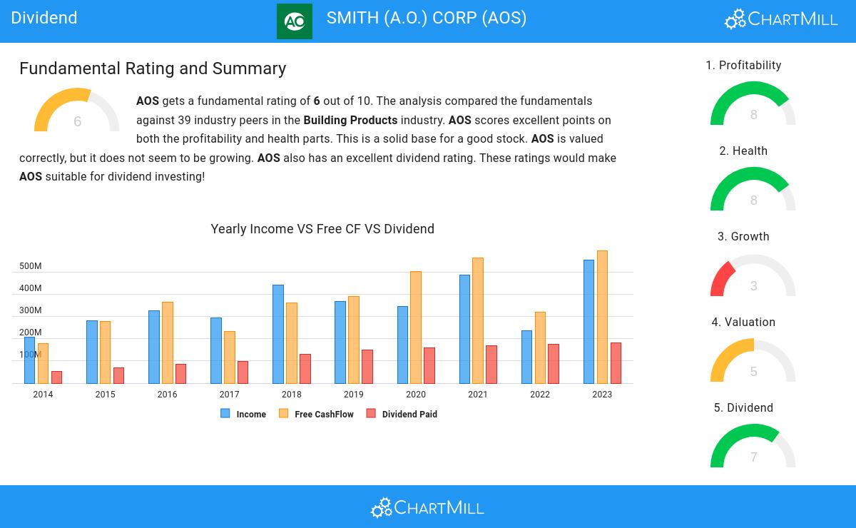 ChartMill assigns a Dividend Rating to each stock, ranging from 0 to 10. This rating is calculated by analyzing various dividend elements, such as yield, historical performance, dividend growth, and sustainability. NYSE:AOS has been awarded a 7 for its dividend quality: