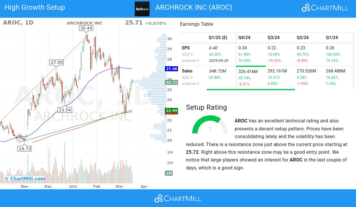 AROC has an excellent technical rating and also presents a decent setup pattern. Prices have been consolidating lately and the volatility has been reduced. There is a resistance zone just above the current price starting at 25.72. Right above this resistance zone may be a good entry point. We notice that large players showed an interest for AROC in the last couple of days, which is a good sign.