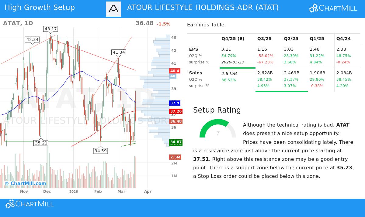 Atour Lifestyle Holdings Ltd. (NASDAQ:ATAT) offers an example for this joined method. As a top lifestyle hotel brand in China, Atour has established a system of more than 800 hotels, setting itself apart with themed lodgings and a concentration on the domestic mid-to-high-end market. The firm's fundamental picture indicates a forceful growth path, while its recent price movement displays a stock settling inside a set band, a frequent forerunner to a technical breakout.