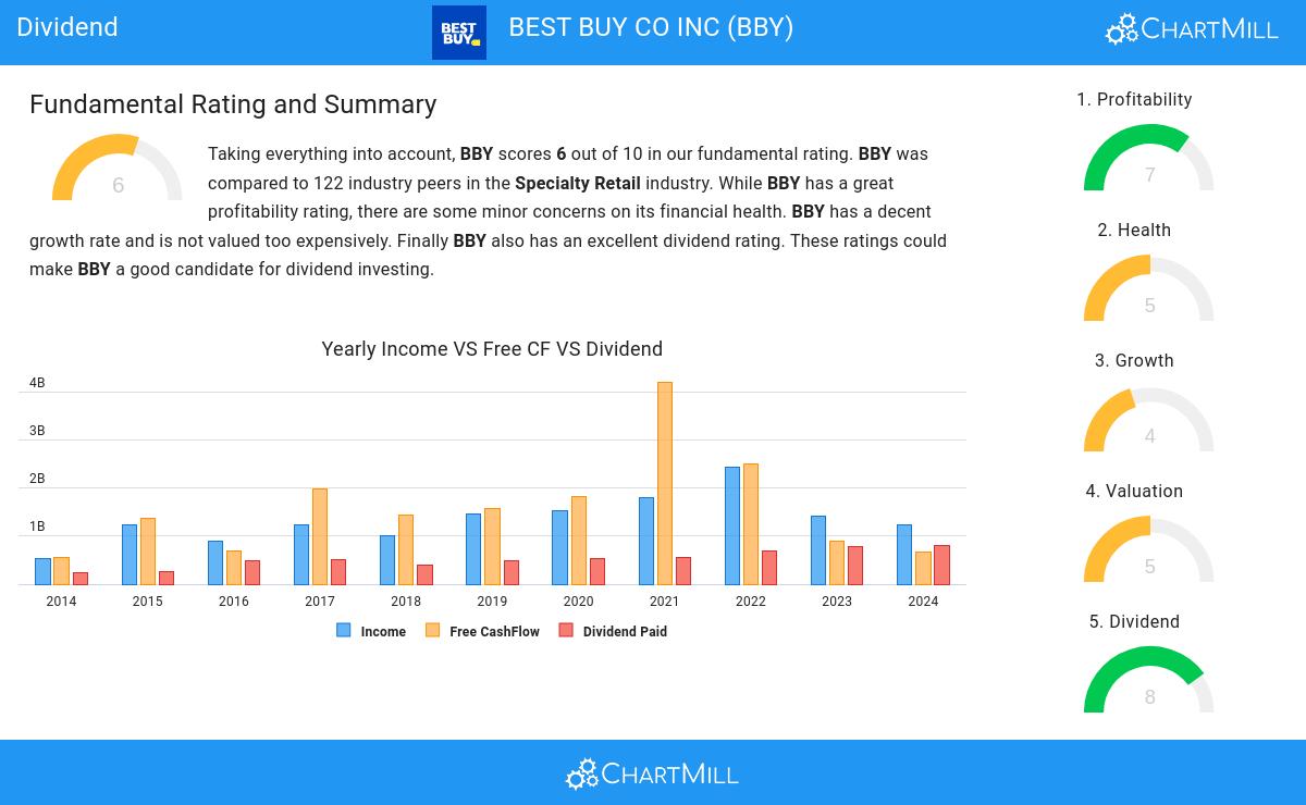 To gauge a stock's dividend quality, ChartMill utilizes a Dividend Rating ranging from 0 to 10. This comprehensive assessment considers various dividend aspects, including yield, history, growth, and sustainability. NYSE:BBY has achieved a 8 out of 10: