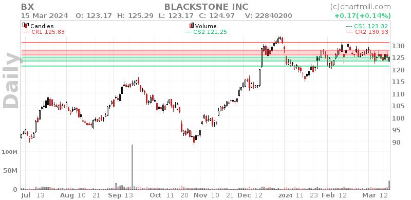 - BX is currently trading in the upper part of its 52 week range. The S&P500 Index however is currently trading near a new high, so BX is lagging the market slightly.