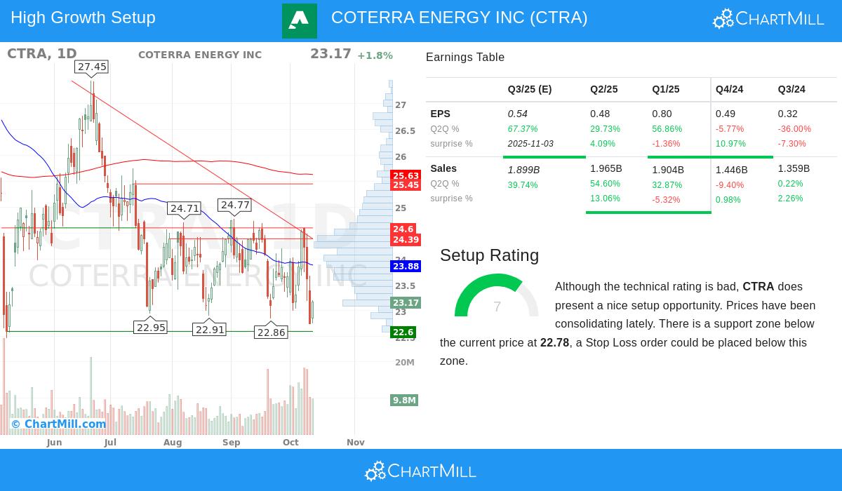 From a technical view, the overall score is low because of negative short and long-term directions. However, the more detailed technical analysis report for CTRA shows a hopeful "setup rating" of 7 out of 10. This points out an important difference within the screening method: it looks for stocks that might be coming out of a downward or sideways period, not only those already in a strong upward trend.