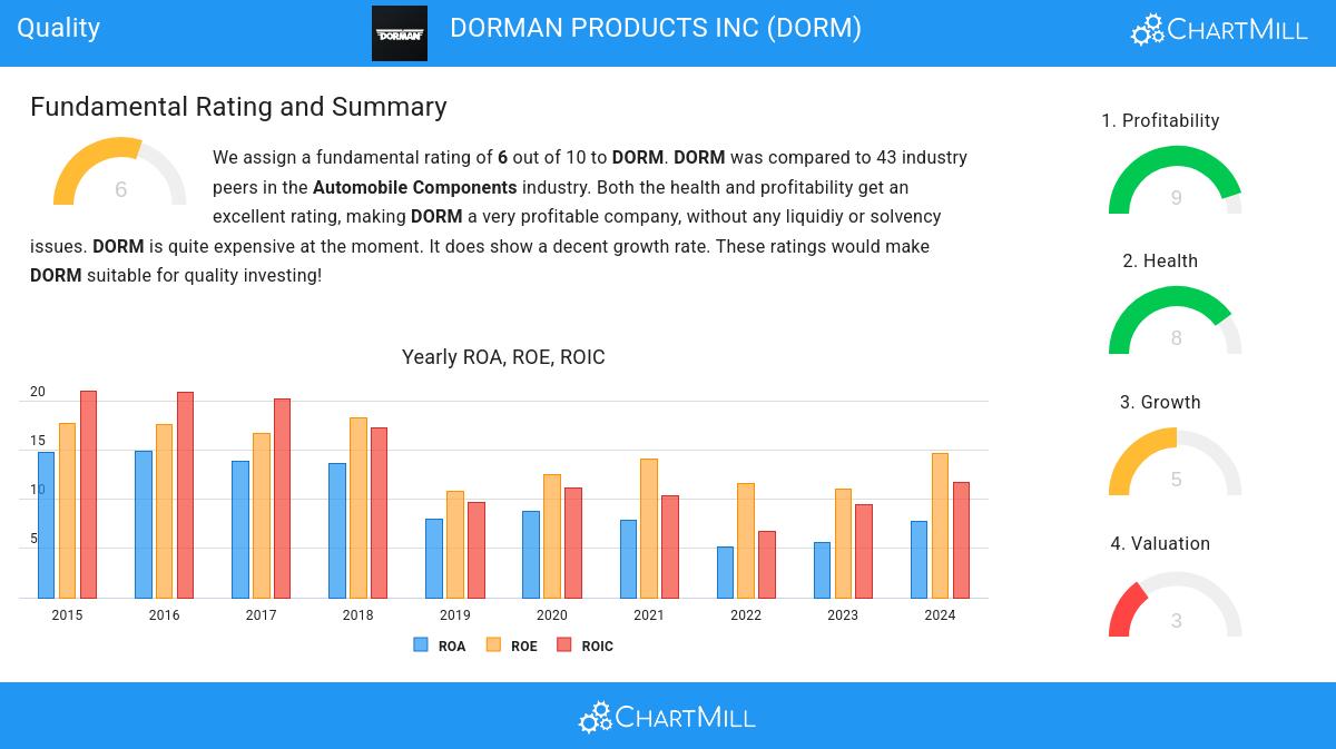 We assign a fundamental rating of 6 out of 10 to DORM. DORM was compared to 43 industry peers in the Automobile Components industry. DORM gets an excellent profitability rating and is at the same time showing great financial health properties. DORM is quite expensive at the moment. It does show a decent growth rate. With these ratings, DORM could be worth investigating further for quality investing!.