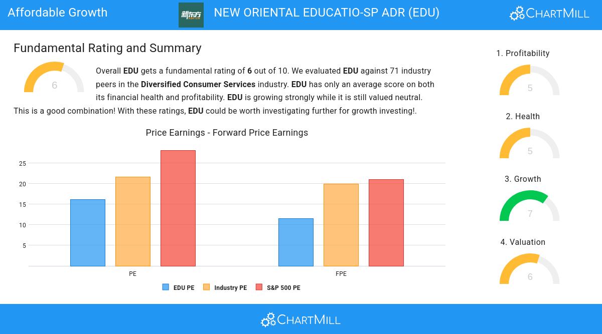 ChartMill assigns a proprietary Valuation Rating to each stock. The score is computed by evaluating various valuation aspects, like price to earnings and free cash flow, both absolutely as relative to the market and industry. EDU was assigned a score of 6 for valuation: