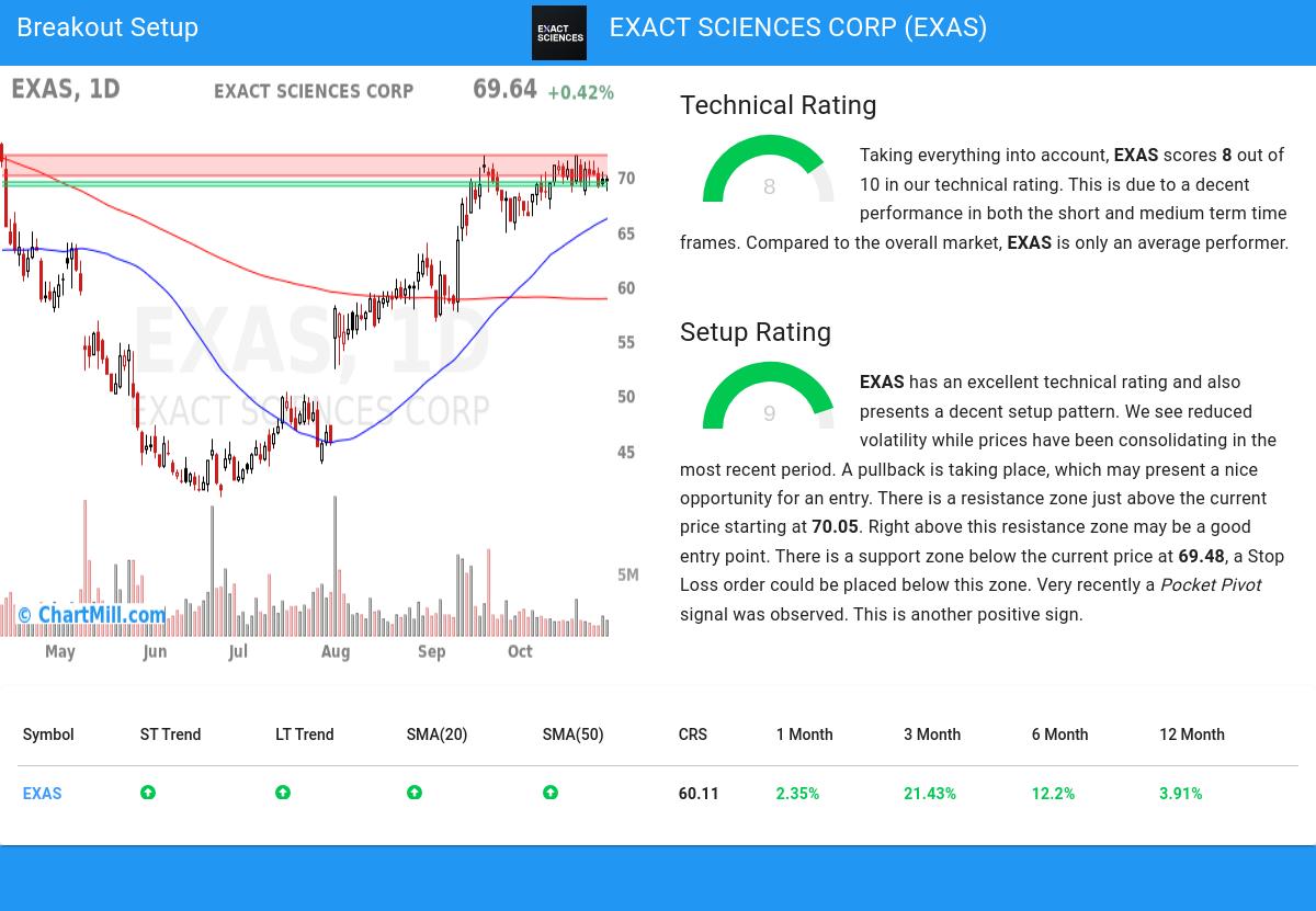 EXACT SCIENCES CORP (NASDAQ:EXAS) was identified as a Technical Breakout Setup Pattern by our stockscreener. Such a pattern occurs when we see a pause in a strong uptrend: after a strong rise the stock is consolidating a bit and at some point the trend may be continued. Whether this actually happens can not be predicted of course, but it may be a good idea to keep and eye on NASDAQ:EXAS.