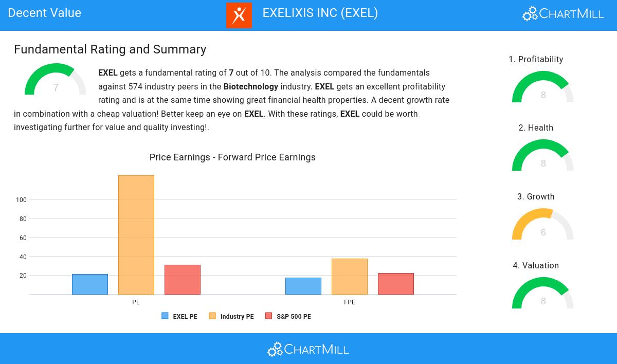 ChartMill assigns a proprietary Valuation Rating to each stock. The score is computed by evaluating various valuation aspects, like price to earnings and free cash flow, both absolutely as relative to the market and industry. NASDAQ:EXEL was assigned a score of 8 for valuation: