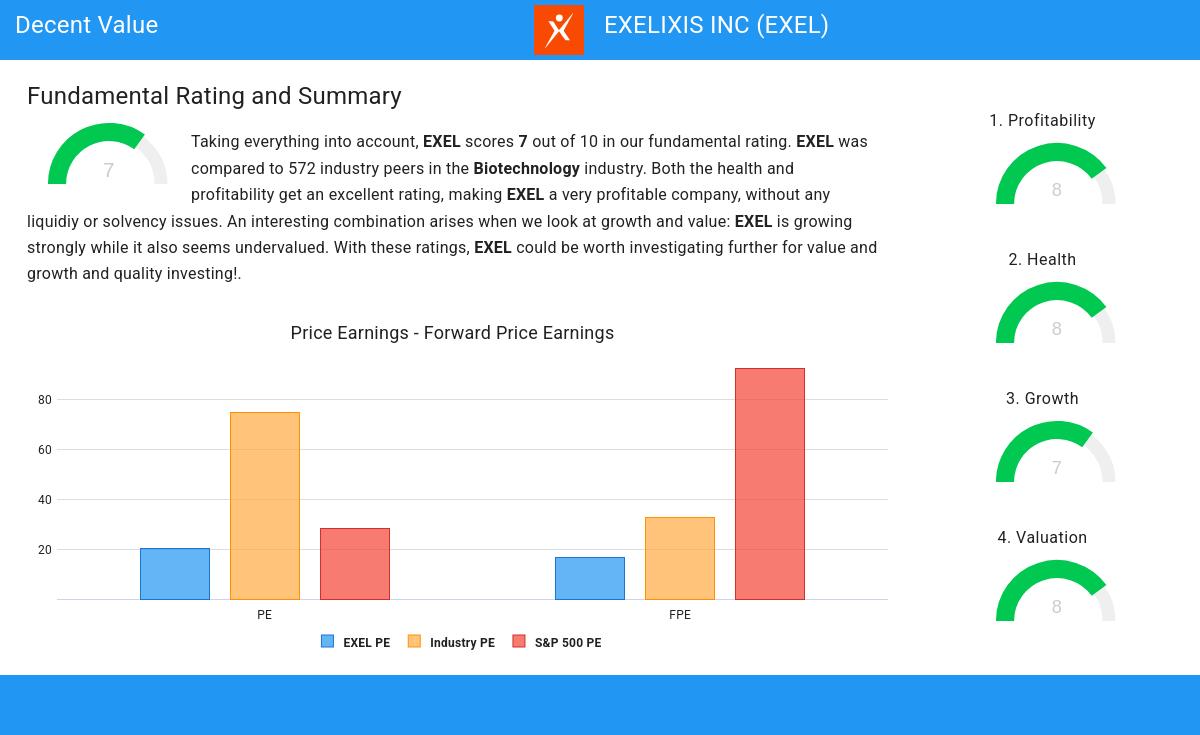 ChartMill provides a Valuation Rating to every stock, ranging from 0 to 10. This rating assesses various valuation aspects, comparing price to earnings and cash flows, while considering factors like profitability and growth. NASDAQ:EXEL boasts a 8 out of 10: