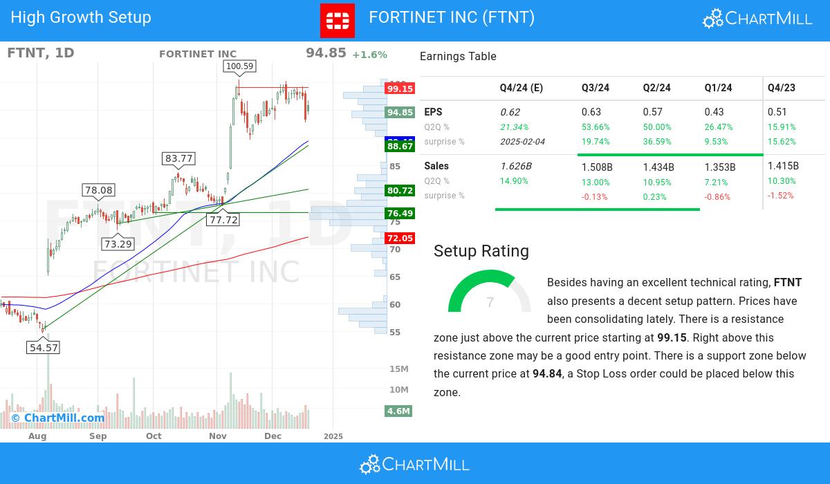 Besides having an excellent technical rating, FTNT also presents a decent setup pattern. Prices have been consolidating lately. There is a resistance zone just above the current price starting at 99.15. Right above this resistance zone may be a good entry point. There is a support zone below the current price at 94.84, a Stop Loss order could be placed below this zone.