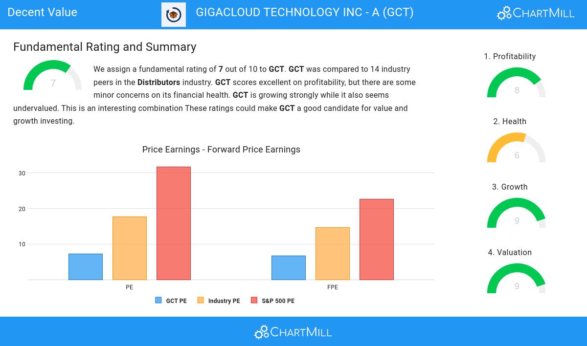 ChartMill assigns a Valuation Rating to every stock. This score ranges from 0 to 10 and evaluates the different valuation aspects and compares the price to earnings and cash flows, while taking into account profitability and growth. NASDAQ:GCT scores a 9 out of 10: