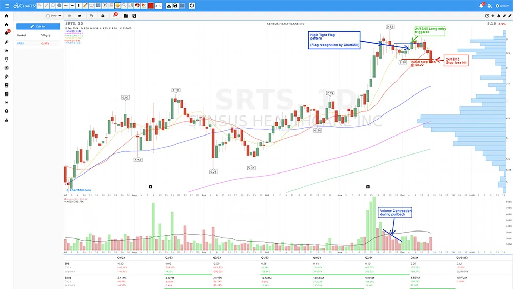 This stock not only popped up in the High Growth Momentum screen but in addition ChartMil recognized a bullish flag pattern (Also take a look at the High Tight Flag Pattern screen) on date of 04/12/2024, causing the stock to end up in my watchlist.