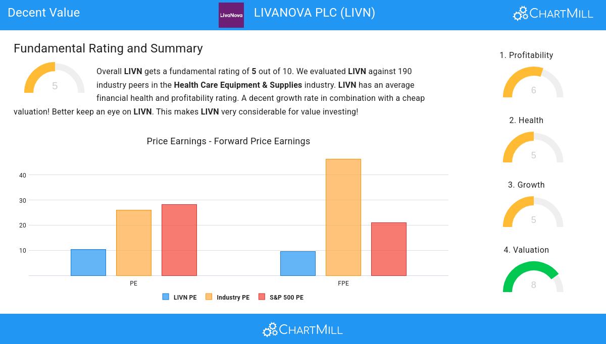 To assess a stock's valuation, ChartMill utilizes a Valuation Rating on a scale of 0 to 10. This comprehensive assessment considers various valuation aspects, comparing price to earnings and cash flows, while factoring in profitability and growth. LIVN has achieved a 8 out of 10: