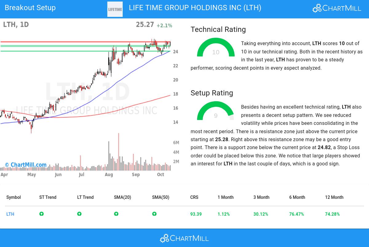 LIFE TIME GROUP HOLDINGS INC (NYSE:LTH) was identified as a Technical Breakout Setup Pattern by our stockscreener. Such a pattern occurs when we see a pause in a strong uptrend: after a strong rise the stock is consolidating a bit and at some point the trend may be continued. Whether this actually happens can not be predicted of course, but it may be a good idea to keep and eye on NYSE:LTH.