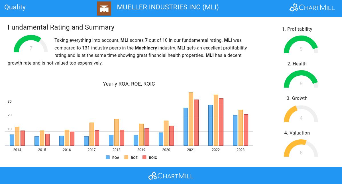 Taking everything into account, MLI scores 7 out of 10 in our fundamental rating. MLI was compared to 131 industry peers in the Machinery industry. MLI has outstanding health and profitabily ratings, belonging to the best of the industry. This is a solid base for any company. MLI has a decent growth rate and is not valued too expensively.