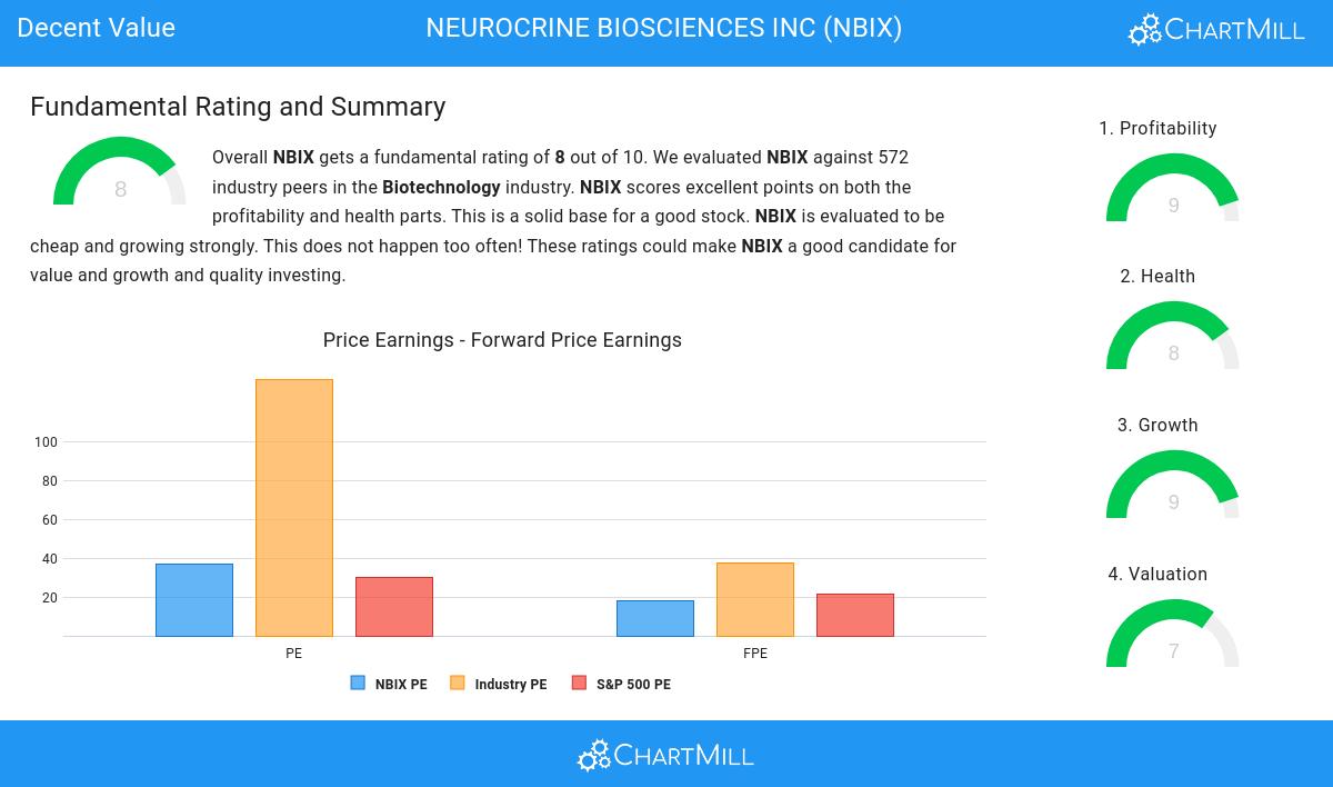 ChartMill assigns a proprietary Valuation Rating to each stock. The score is computed by evaluating various valuation aspects, like price to earnings and free cash flow, both absolutely as relative to the market and industry. NASDAQ:NBIX was assigned a score of 7 for valuation: