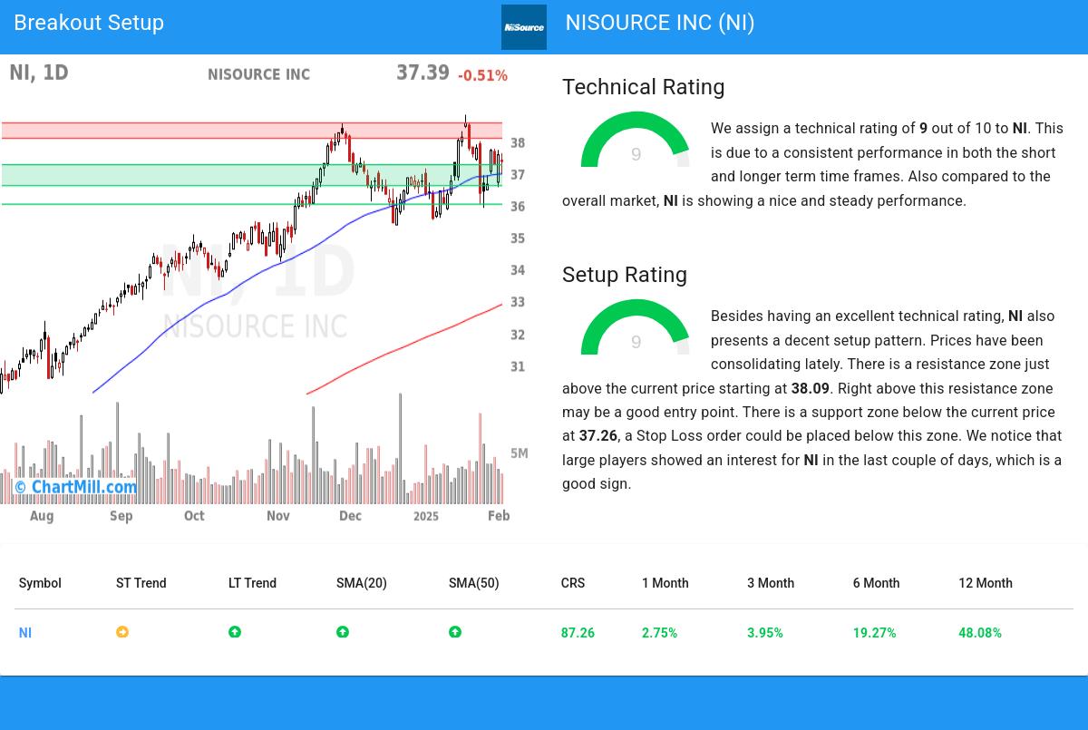 Alongside the Technical Rating, ChartMill assigns a Setup Rating to evaluate the consolidation level of a stock. This rating, ranging from 0 to 10, is updated daily and considers various short-term technical indicators. The current setup rating for NYSE:NI is 9: