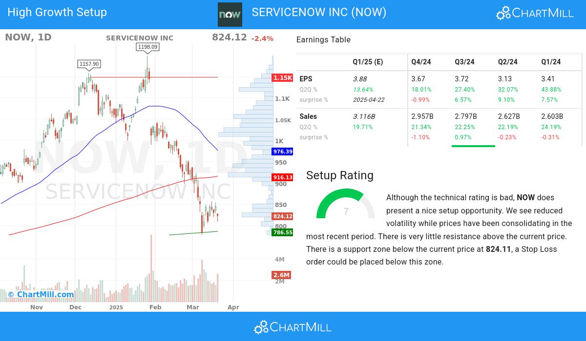 ChartMill provides a Setup Rating for each stock. This rating, ranging from 0 to 10, assesses the level of consolidation in the stock based on multiple short-term technical indicators. Currently, NOW has a 7 as its setup rating, indicating its current consolidation status.
