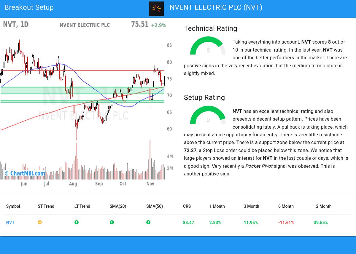 Our stock screener has identified NVENT ELECTRIC PLC (NYSE:NVT) as a potential breakout candidate. This technical breakout setup pattern occurs when the stock consolidates after a strong uptrend. While the actual breakout is uncertain, it may be worth keeping an eye on NYSE:NVT.