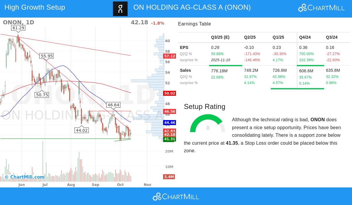 On Holding AG presents a case of a company with very fast fundamental growth and a good financial foundation, currently trading in a technical position that may offer a positive risk-reward entry point. The stock fits a growth-and-breakout plan by showing: