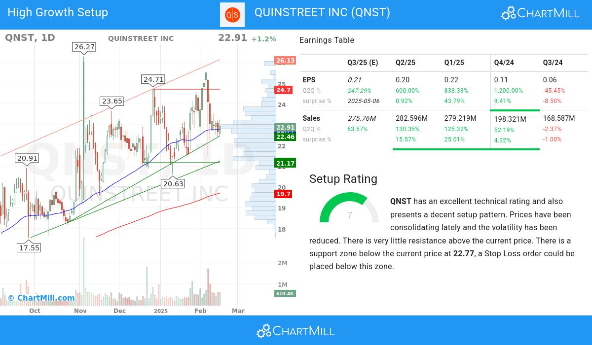 Alongside the Technical Rating, ChartMill assigns a Setup Rating to evaluate the consolidation level of a stock. This rating, ranging from 0 to 10, is updated daily and considers various short-term technical indicators. The current setup rating for NASDAQ:QNST is 7: