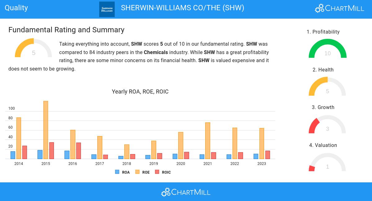 SHW gets a fundamental rating of 5 out of 10. The analysis compared the fundamentals against 84 industry peers in the Chemicals industry. While SHW belongs to the best of the industry regarding profitability, there are some minor concerns on its financial health. SHW is valued expensive and it does not seem to be growing.
