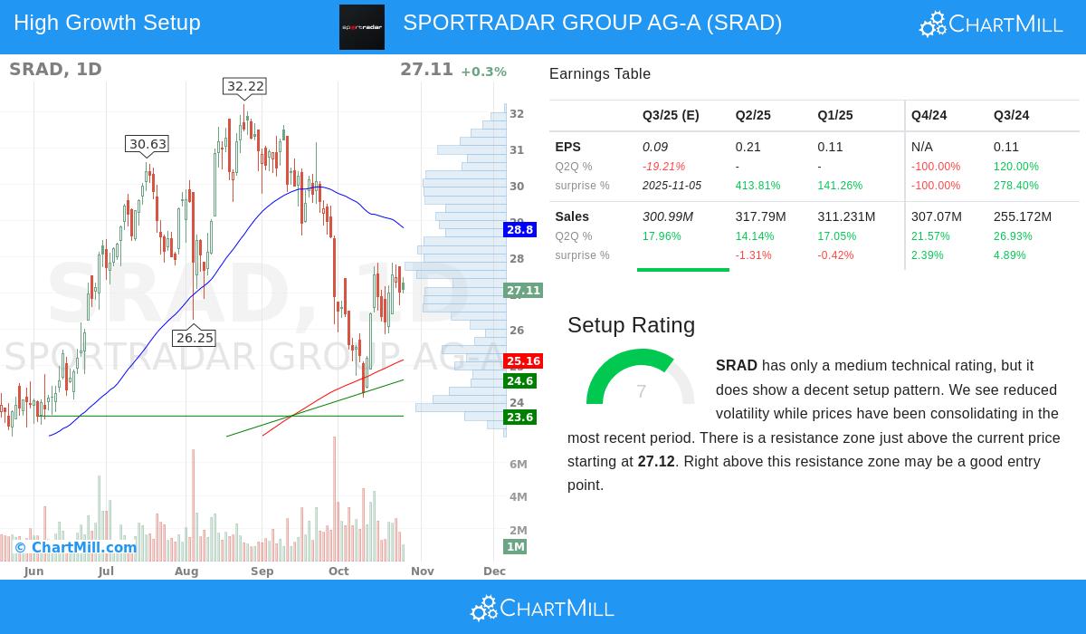From a technical viewpoint, Sportradar shows an interesting setup with a Technical Rating of 6/10 and a more interesting Setup Rating of 7/10. The stock's technical formation shows it moving within a set band, indicating a chance for a clear directional move. Important technical points are: