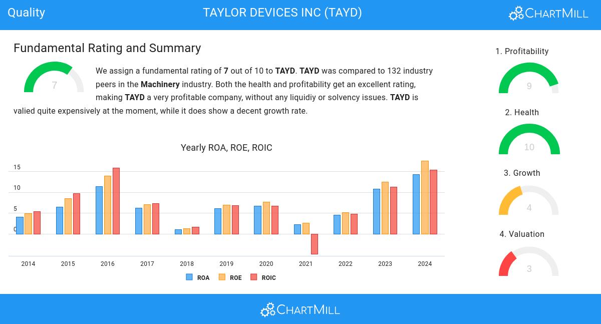 Quality investors are looking for the best of the best. Companies which are growing steadily and consistently, but are also in excellent financial condition. We will have a look here to see if TAYLOR DEVICES INC (NASDAQ:TAYD) is suited for quality investing. Investors should of course do their own research, but we spotted TAYLOR DEVICES INC showing up in our Caviar Cruise quality screen, so it may be worth spending some more time on it.
