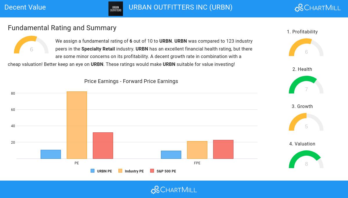 ChartMill assigns a Valuation Rating to each stock, ranging from 0 to 10. This rating is calculated by analyzing different valuation elements, such as price to earnings and free cash flow, both in absolute terms and relative to the market and industry. In the case of NASDAQ:URBN, the assigned 8 reflects its valuation: