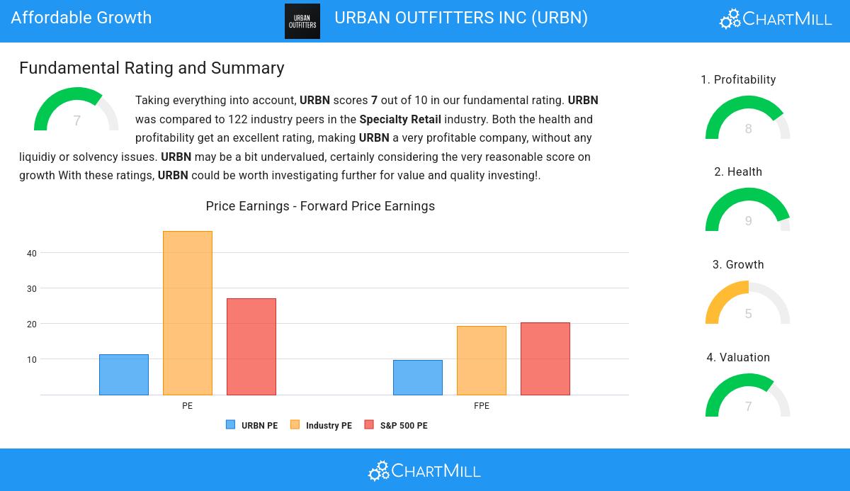 Taking everything into account, URBN scores 7 out of 10 in our fundamental rating. URBN was compared to 122 industry peers in the Specialty Retail industry. URBN has outstanding health and profitabily ratings, belonging to the best of the industry. This is a solid base for any company. URBN scores decently on growth, while it is valued quite cheap. This could make an interesting combination. This makes URBN very considerable for value and quality investing!