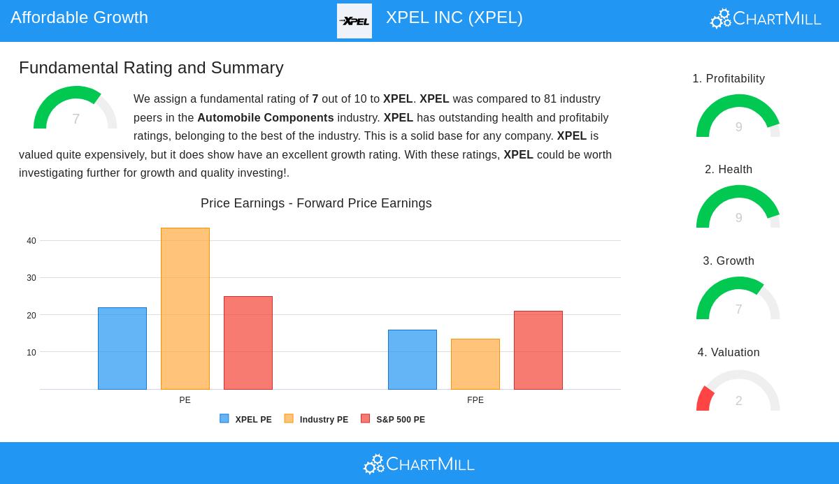 Our fundamental analysis report rates XPEL a 7 out of 10, with high marks for profitability and financial health. Key strengths include: