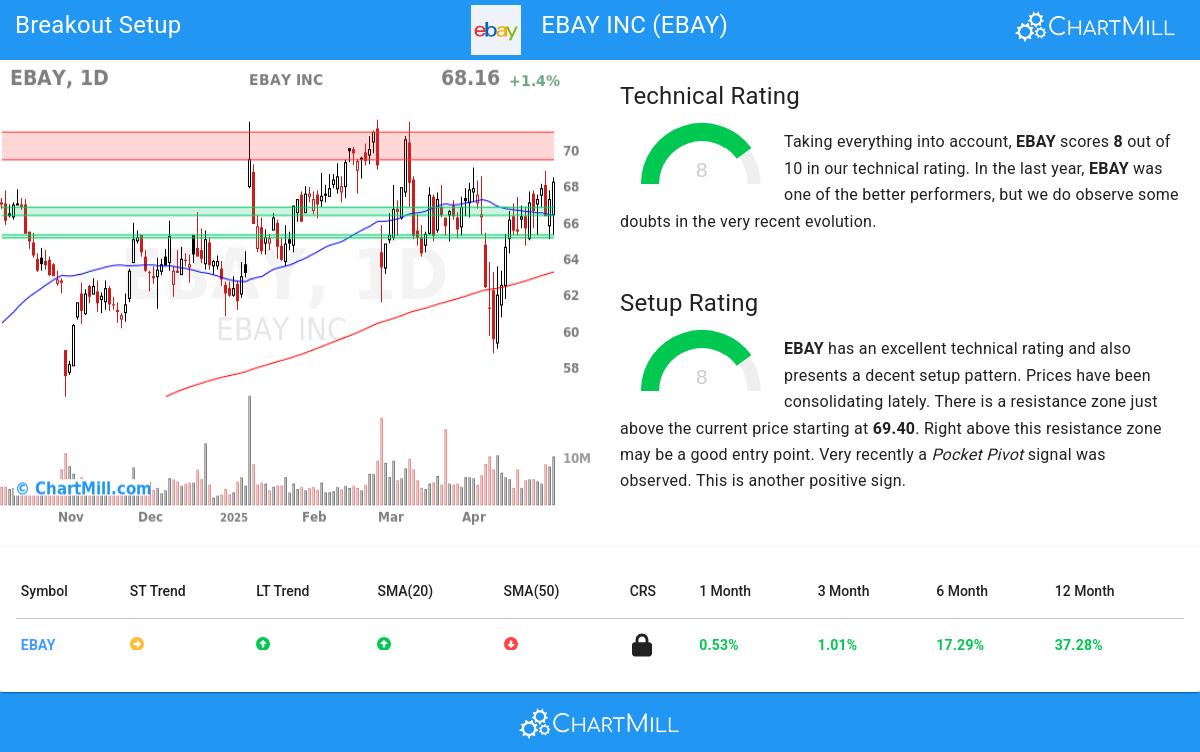 EBAY has a Technical Rating of 8 and a Setup Rating of 8, indicating both strong momentum and a well-defined consolidation pattern. The stock’s long-term trend remains positive, while the short-term trend is neutral, suggesting a potential continuation of upward movement after a period of stability.