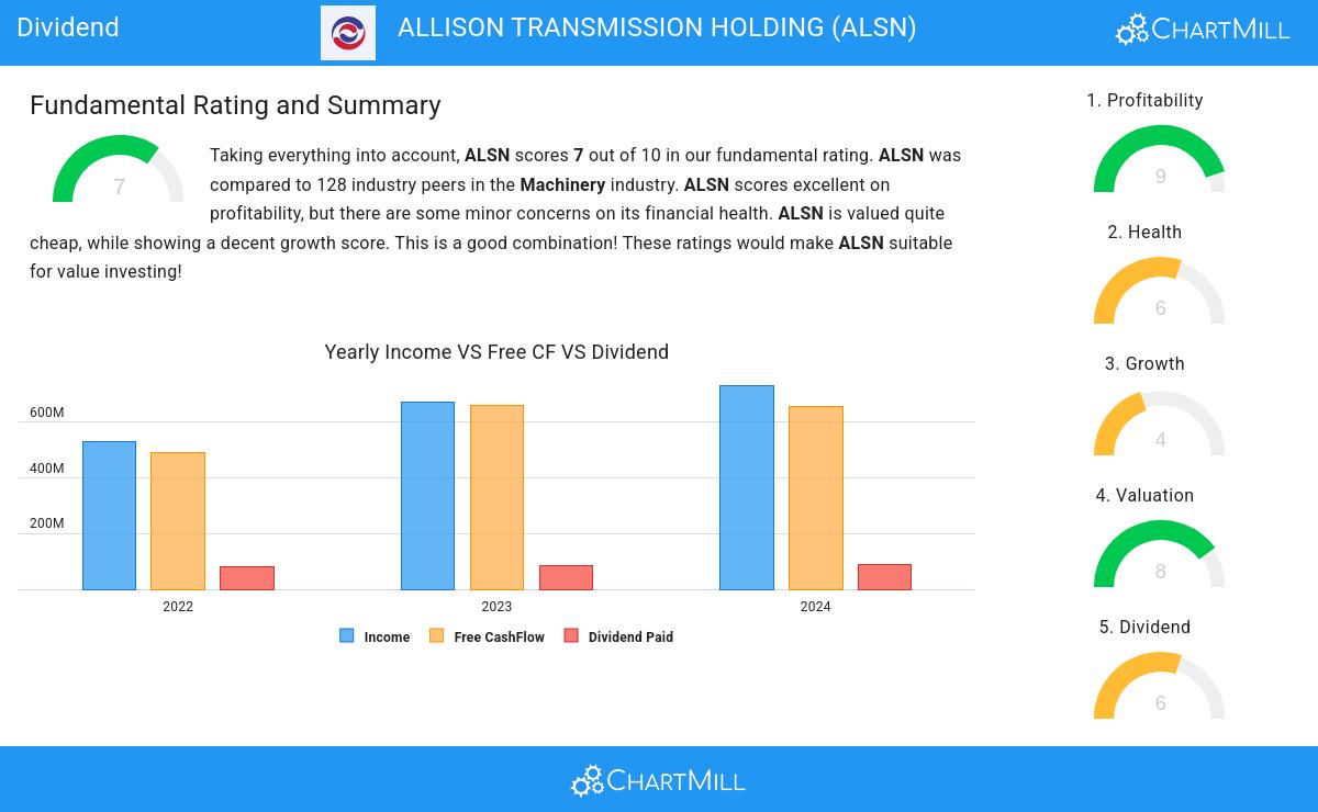 Allison Transmission (NYSE:ALSN) has a ChartMill Dividend Rating of 6.0, reflecting a reasonable balance between yield and sustainability. The company pays a dividend yield of 1.17%, slightly below the S&P 500 average but with a 10.94% annual dividend growth rate over the past decade. Importantly, the payout ratio is just 11.90%, meaning the company retains ample earnings to reinvest while maintaining dividend stability.